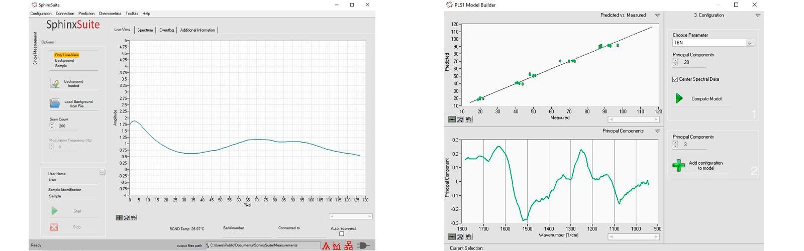 • Analysis of samples measured online based on pre-established chemometric models (ANN, SIX, PLS)