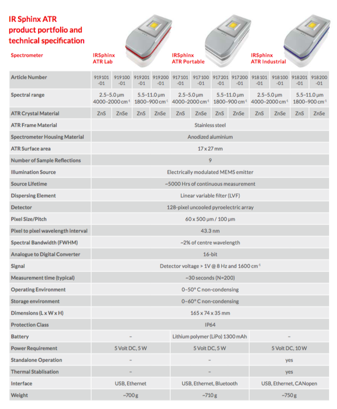 IR Sphinx ATR product range uses the concept of Attenuated Total Reflection to record an infrared spectrum of a sample. The products are available in the wavelength range from 2.5–5.0 µm or of 5.5–11.0 µm. The spectral resolution varies between 18cm-1 and 36cm-1. All spectrometers include our proprietary software SphinxSuite which runs on all commonly used operating systems. The products are battery operated without having any moving parts and are designed to be truly portable. The IR Sphinx ATR spectrometer are available in three different configurations namely IR Sphinx Lab, IR Sphinx Industrial or IR Sphinx Portable.