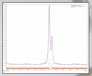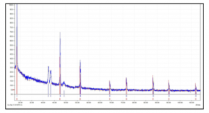 The peaks are measured on LaB6 , a well accepted standard to quantify the attainable resolution of a powder diffractometer. Profile fitting of these two peaks shows an FWHM of 0.10° in 2Ɵ.